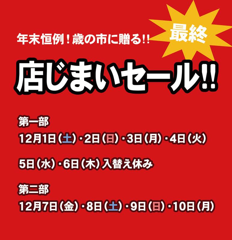 こんにちは 寒いさむいと思えば、もう12月間近となりました 皆様いかがお過ごしでしょうか 毎年行っておりますはなぶさ「歳の市」ですが、 今年は来年に店舗が移転する関係もあり 「店じまいセール」として開催させていただきます