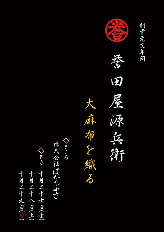 こんにちは 本日は雨の予報と聞いていましたが、 降りそうで降らない、そんなお日和となりました 皆様いかがお過ごしでしょうか はなぶさ毎年の恒例行事となりました、 誉田屋源兵衛展 大麻布を織る 10月27日(金) […]