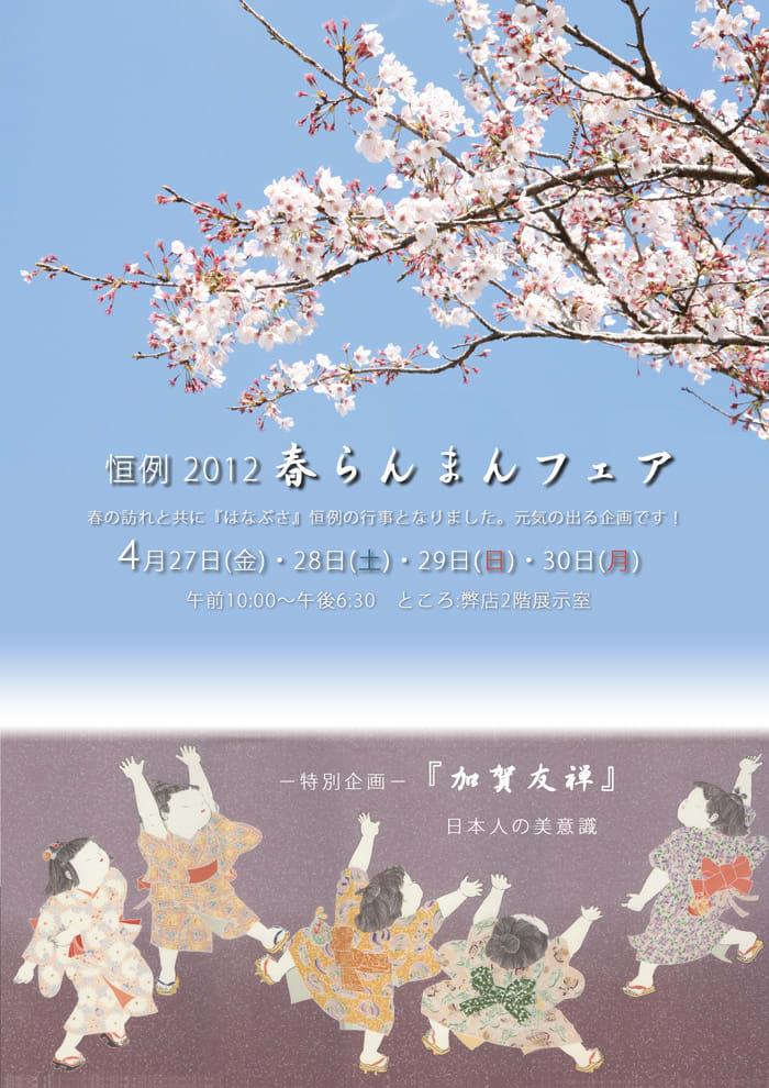 こんにちは 昨日から雨模様ですが、いかがお過ごしでしょうか さて、明日から30日までの4日間 はなぶさ恒例2012年『春らんまんフェア』を開催致します 今年の特別企画は『加賀友禅』 訪問着、色留袖、黒留袖などを多数取り揃