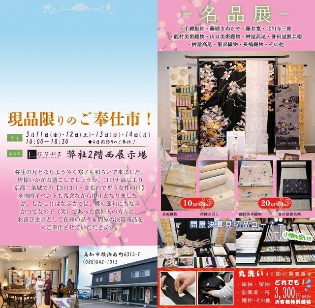 こんばんは(^^♪ 明日3/11金曜日より「名品展」を開催いたします。 4日間開催です。 お買い得商品や逸品着物を大ご奉仕致します。 この4日間だけ着物のクリーニングが激安価格でご奉仕!! 是非この機会にご来店くださいま