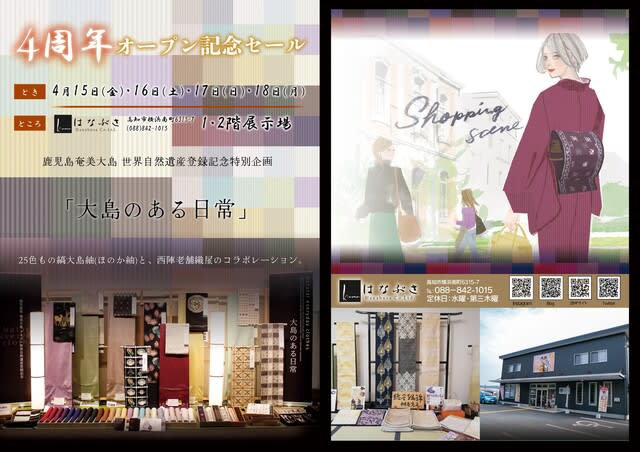 明日4月15日(金)より【4周年のオープン記念セール】お陰様で移転オープン4周年を迎えることが出来ました。誠にありがとうございます!今回は鹿児島奄美大島 世界自然遺産登録記念特別企画としまして「大島のある日常」を開催し